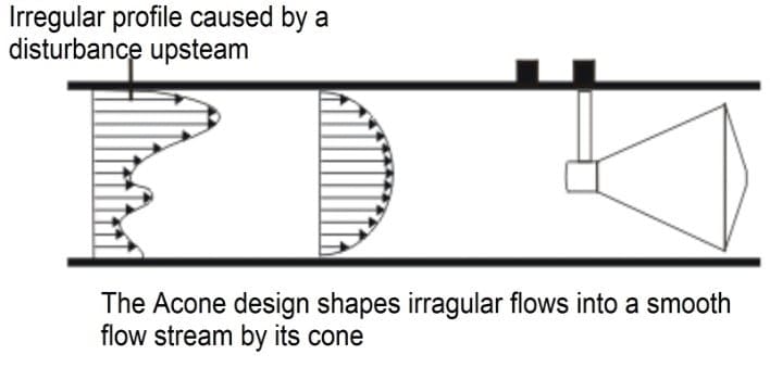 Flow is calculated by the Bernoulli equation of conservation of energy. The cone shape also acts as its own flow conditioner, fully conditioning any turbulence inflow due to limited upstream and downstream straight runs.