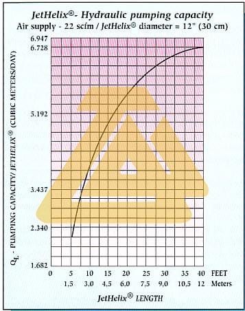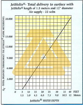 In addition to its high oxygen transfer capacity, as shown by the Oxygen Curves, the Jet-Helix Diffuser also functions as a liquid pump. The hydraulic pumping capacity depends on the height of the diffuser.