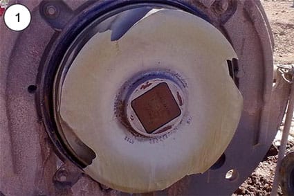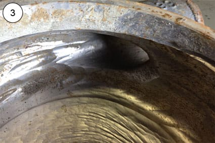 Photo 3 shows a standard hard iron case after only 5 service days. Deep wear trenches are clearly visible in the case walls because of the lower fracture toughness and hardness. Significant corrosion can also be seen on the exposed surfaces.