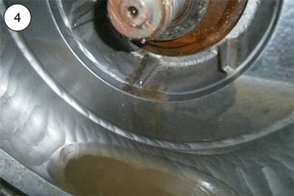 Photo 4 shows a new MAXALLOY® 5A case after 21 service days. The wear pattern shows plastic deformation instead of wear trenches, indicating high and uniform hardness distribution through the pump case wall. The MAXALLOY® 5A case also shows no sign of corrosion.